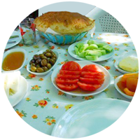 Haftasonunu keyifli bir gün geçirmek isteyenlerin aklına ilk gelen ve tercih edilen mekanların başında gelen restoranda, kahvaltı öncesi taze sıkılmış nar veya portakal suyu, köylü kadınların yaptığı sıcacık köy ekmeği ve köy tereyağının yanı sıra Özel olarak hazırlanan ve başka hiçbir yerde bulamayacağınız Datça bademli zeytini bal, peynir çeşitleri, çilek reçeli, koska çikolata, tahinli pekmez, yoğurtlu kızartma, çökelek, domates ve yeşillik, sucuklu yumurta, omlet, menemen, patates kroket ve daha birçok çeşit masanızda en iyi servisle size sunuluyor.